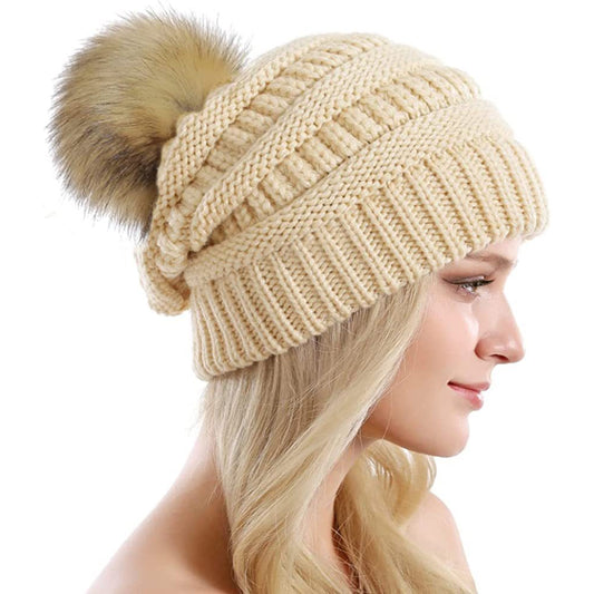 Fashionable Stretchy Lined Fur Pom Beanie Knit Hat