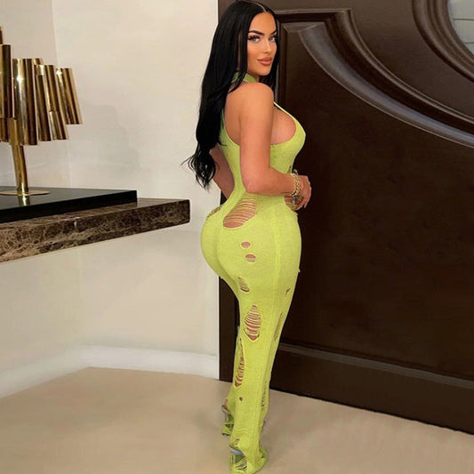 Sleeveless Knitted Ripped High Collar Long Jumpsuit
