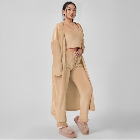3-teiliges, flauschiges, schlichtes Crop-Top und gemütliche Anzug-Sets mit Hose