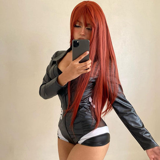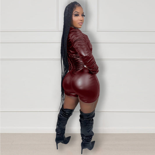 Langärmeliger, plissierter, elastischer Strampler aus Kunstleder