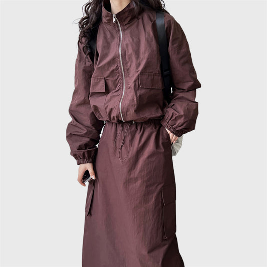 Veste courte à fermeture éclair, jupe fendue avec cordon de serrage, costume cargo 2 pièces